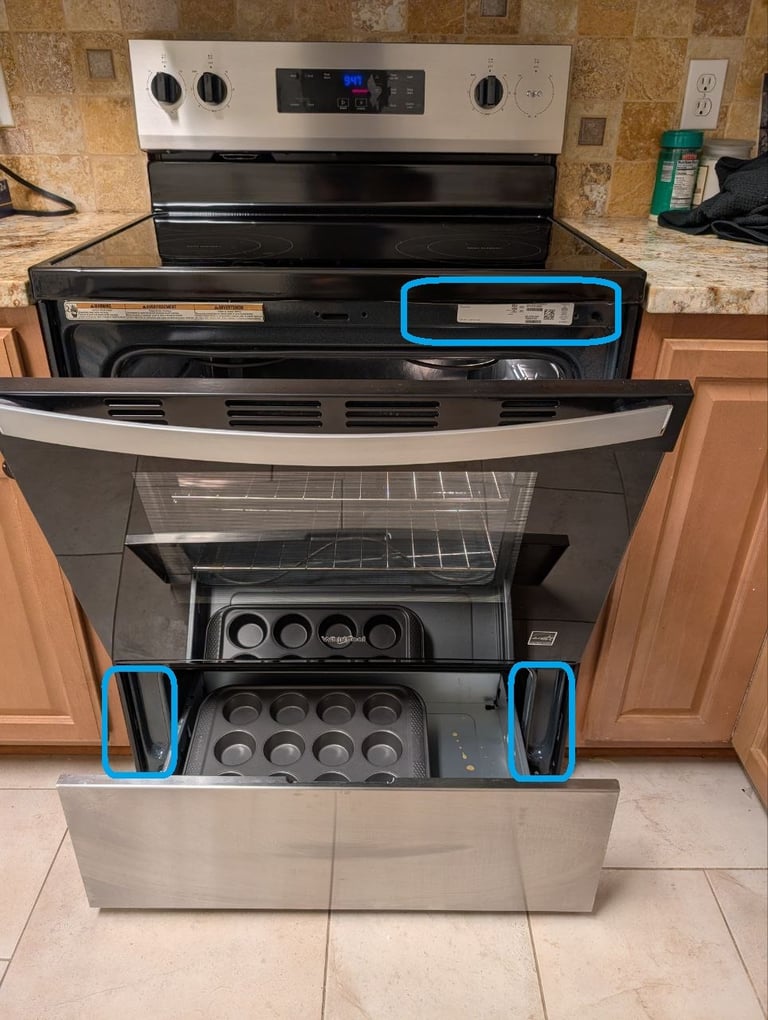 Also, to find the correct part number, you’ll need to locate your model and serial number. Usually, for ranges, you can find this info behind the door or behind the bottom drawer on the front part of the range body. For built-in cooktops, it’s typically located underneath the cooktop. I’ll attach some pictures with arrows pointing out these spots so you can easily find it.
